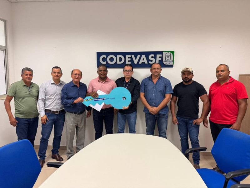 Prefeito Leandro Soares recebeu o maquinário na Codevasf ao lado da equipe municipal; equipamento foi destinado pelo ex-deputado federal Lázaro Botelho.